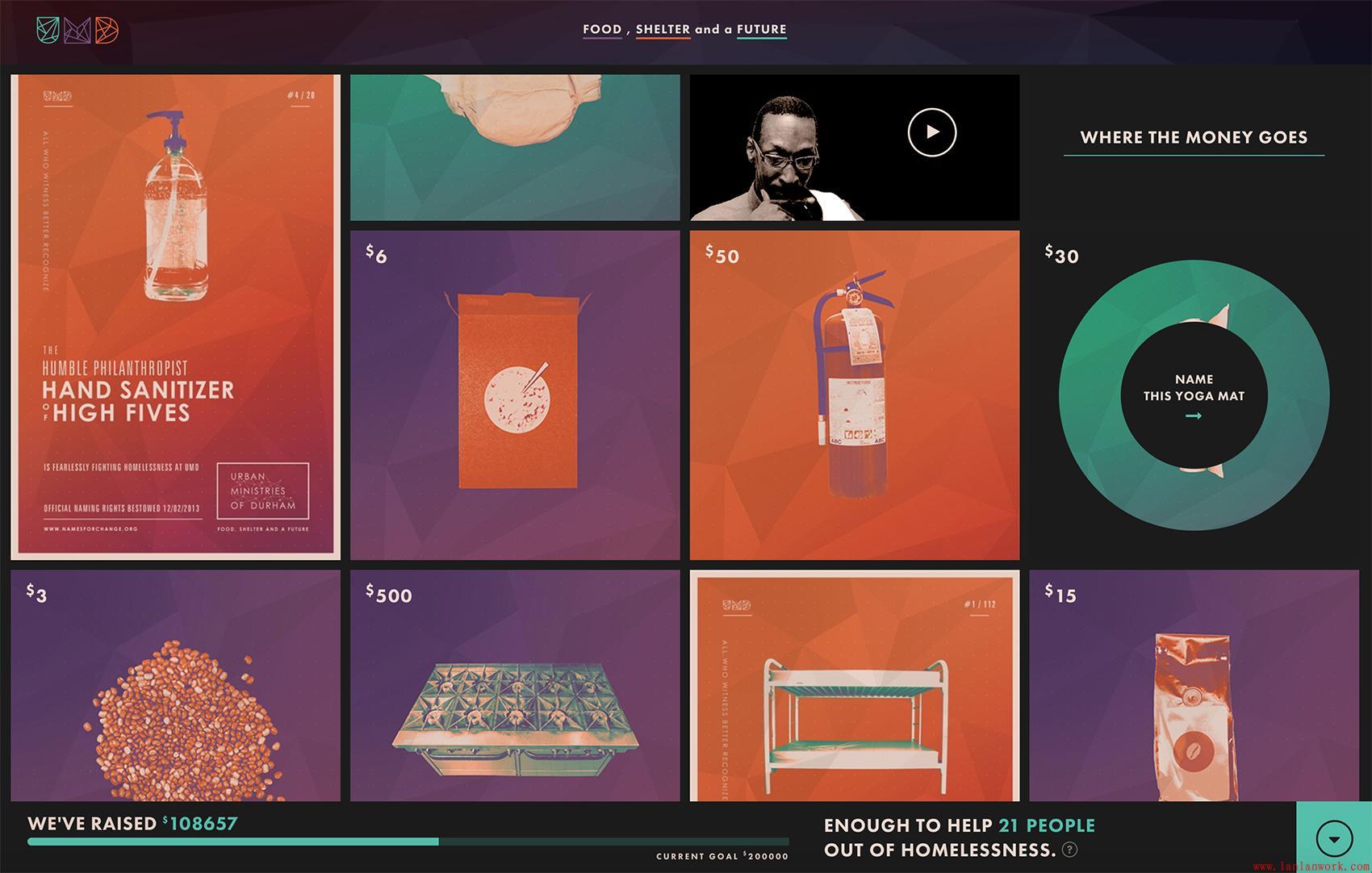 然而,所選擇的音調有助于克服該站點意義的潛在困難之一。為襪子或衛(wèi)生棉條等日常用品籌款并不足以讓自己出售,因此該網站的激進圖形基調提高了日常用品的感知價值,同時建立了必要的基礎組織結構。