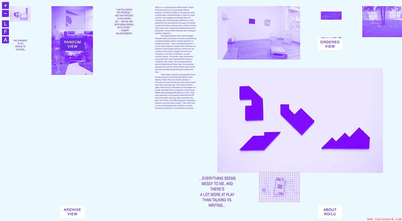 在大多數創(chuàng)意設計工作室的作品集中,作品沒有按層次組織,因為每個項目都是獨特的,并且被認為同樣重要Ro / Lu網站的設計創(chuàng)造了一個動態(tài)的構圖,每次訪問都有不同程度的驚喜,并鼓勵觀眾調查工作室的廣泛組合。因此,設計工作室的折衷,跨學科性質由內容的隨機顯示。