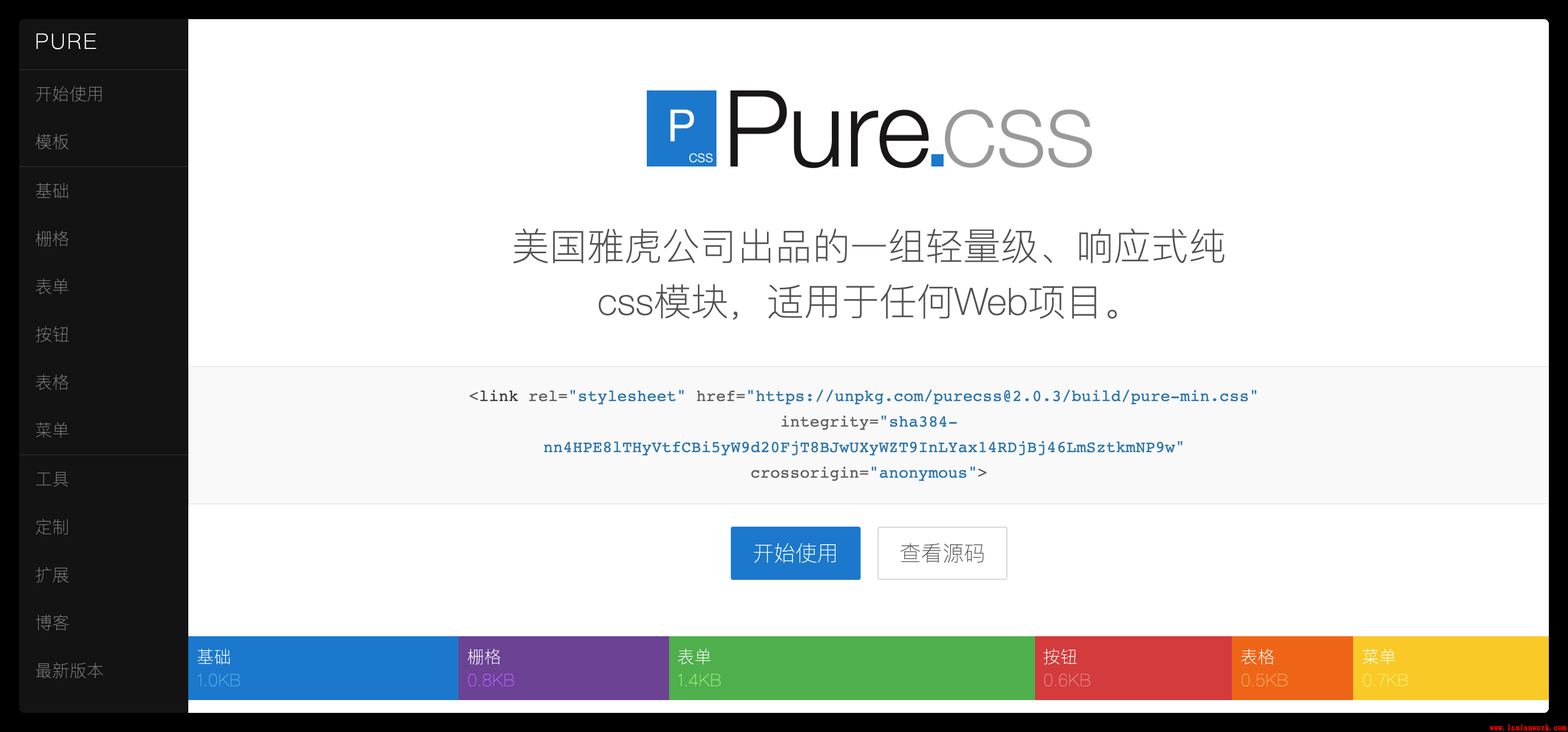 Pure 非常輕量級,經過壓縮后不過 3.8KB。這是一個特別為移動端考慮的框架,為了壓縮大小,每一行代碼都經過仔細考量。當然如果你不使用框架給出的全部模塊,體量還可以更小。