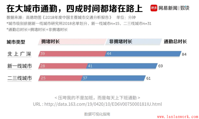 下圖是大城市通勤的時長統計,通過這些柱狀圖,我們能很清晰的看出各個級別的城市通勤時長的比例關系,并了解他們的擁堵時長和非擁堵時長分別是怎樣的情況。
