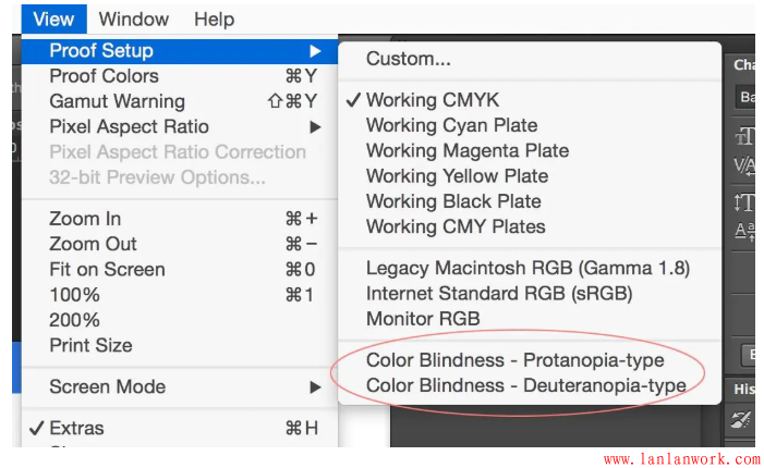 設計師常用的PS和AI提供了模擬紅色盲和綠色盲的校樣設置,選擇“視圖—校樣設置—紅色盲型/綠色盲型”。