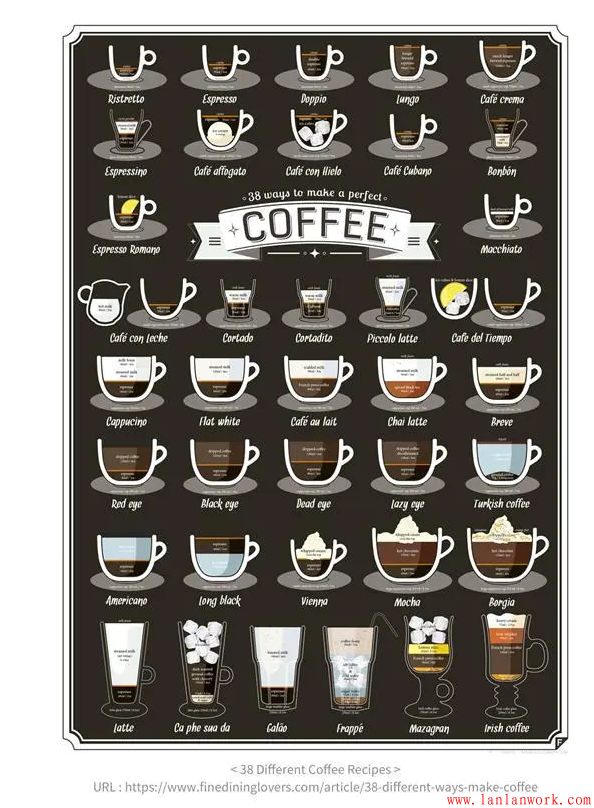 文字有時候是一種匱乏的信息傳遞方式,而可視化的方式,則是人類最本源的一種信息傳遞方式,圖解就是將很多無法準確或用語言傳達的內容,以生動形象的圖形解釋出來。下圖是一張經典的對于咖啡種類圖解,38種咖啡配方,不必要用多余的文字解釋,直接用圖解表示,簡單明了,清晰易懂。