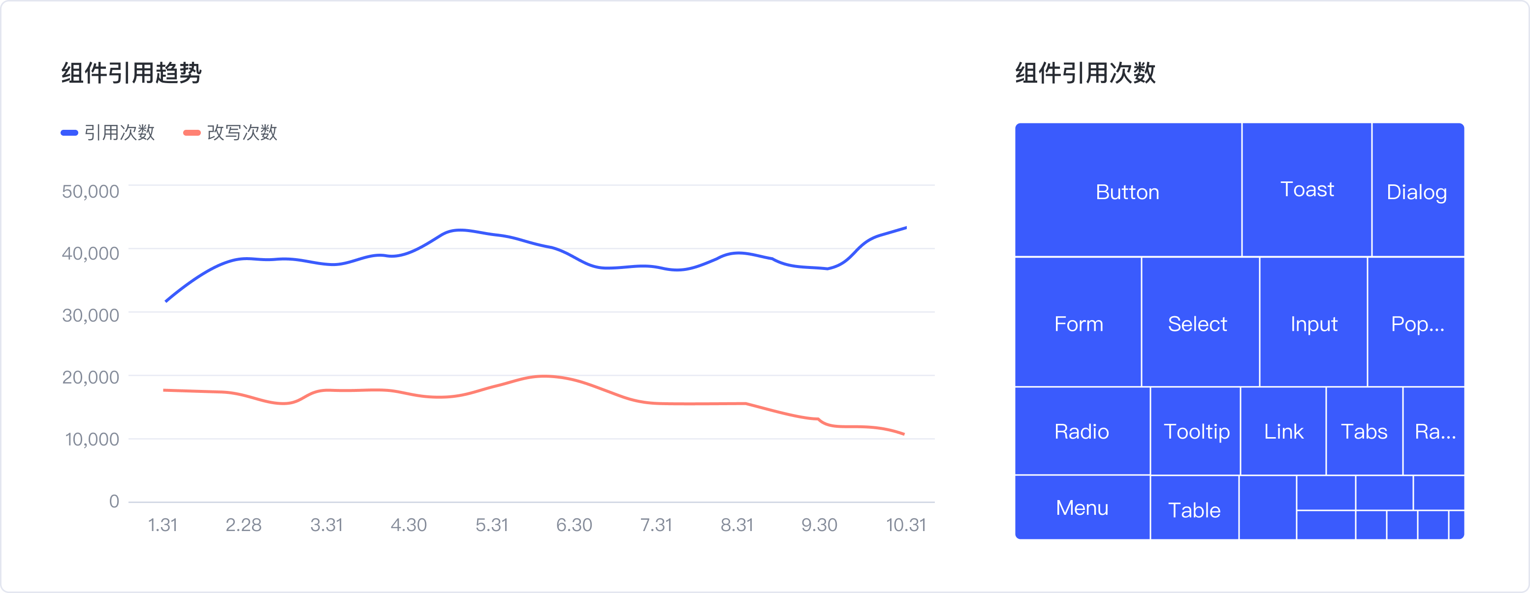 解:把所有組件的引用次數加和,得到總體數值,并結合時間維度,觀察組件庫整體改寫數與引用數各自的變化趨勢。用線形圖來描述的話,隨著時間推移,引用越多,改寫越少,兩條線呈開口狀,那就表示組件庫處于越來越健康的狀態。反之則需要警惕了。同時我們搭建了一套評分體系,基于引用/改寫數值,通過歸一化和加權等一系列計算,by月/季度給組件庫易用性打分,也能精準的知道組件庫易用性的表現,如果分值是下降的,就要具體去定位哪些組件出了問題,再根據上述的方法相應地進行升級。