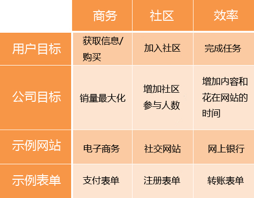 》一書中說的一樣,每個表單的存在必有如下三個原因之一:商務、社區或效率。下面的表單把這三個原因轉化成了其背后的用戶目標和公司目標: