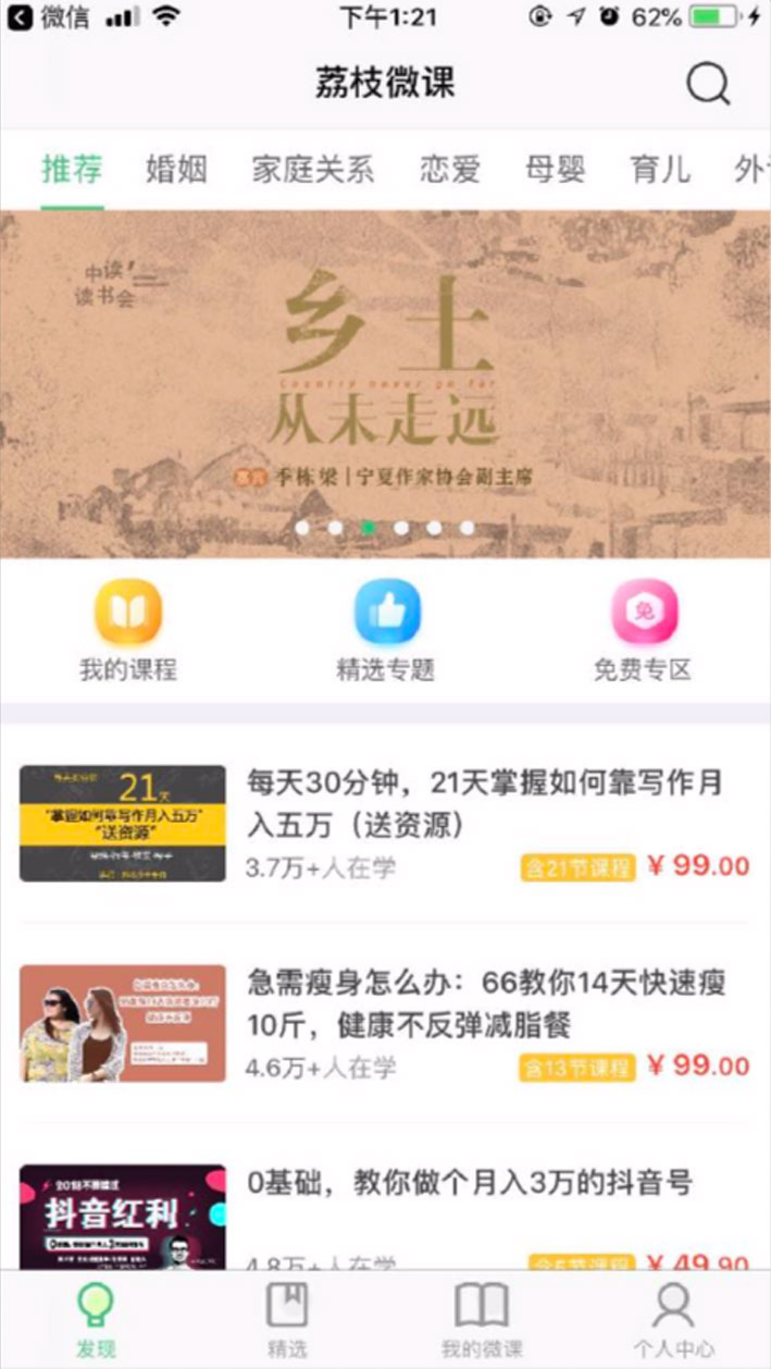 3.中間以三個圖標(biāo)按鈕表示我的課程,精選專題,免費(fèi)專區(qū)快捷入口方便用戶來回 切換;