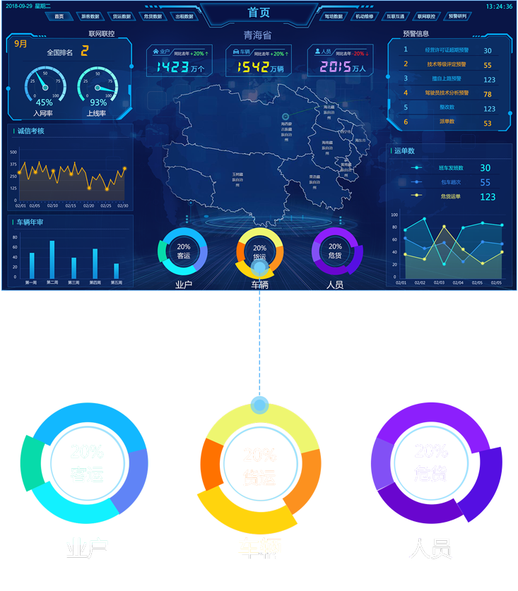 行業態勢展示了道路交通運輸行業的基礎數據和走勢,實時反映行業的運行狀態,將采集的數據形象化、直觀化、具體化。為了加強某些重點工作,我們還需加入“聯網聯控”、“互聯互通”等相關專題。系統所具備的數據管理能力可將現有的數據進行有效的整合,快速準確地提供報表并提出決策依據。